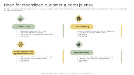This slide provides glimpse about requirement of new customer success journey in the organization that can help the business to expand its customer base and retain good fit customers. It includes customer loyalty, easier forecasting, improved revenue, etc.Coming up with a presentation necessitates that the majority of the effort goes into the content and the message you intend to convey. The visuals of a PowerPoint presentation can only be effective if it supplements and supports the story that is being told. Keeping this in mind our experts created Need For Streamlined Customer Success Journey Analyzing Customer Adoption Journey To Ideas Pdf to reduce the time that goes into designing the presentation. This way, you can concentrate on the message while our designers take care of providing you with the right template for the situation. This slide provides glimpse about requirement of new customer success journey in the organization that can help the business to expand its customer base and retain good fit customers. It includes customer loyalty, easier forecasting, improved revenue, etc.