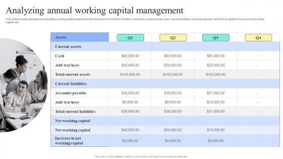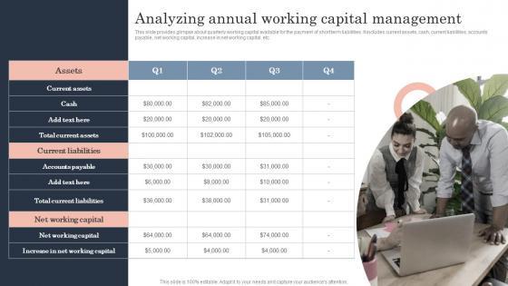 This slide provides glimpse about quarterly working capital available for the payment of short term liabilities. It includes current assets, cash, current liabilities, accounts payable, net working capital, increase in net working capital, etc.Coming up with a presentation necessitates that the majority of the effort goes into the content and the message you intend to convey. The visuals of a PowerPoint presentation can only be effective if it supplements and supports the story that is being told. Keeping this in mind our experts created Analyzing Annual Working Capital Management Effective Planning For Monetary Background PDF to reduce the time that goes into designing the presentation. This way, you can concentrate on the message while our designers take care of providing you with the right template for the situation.