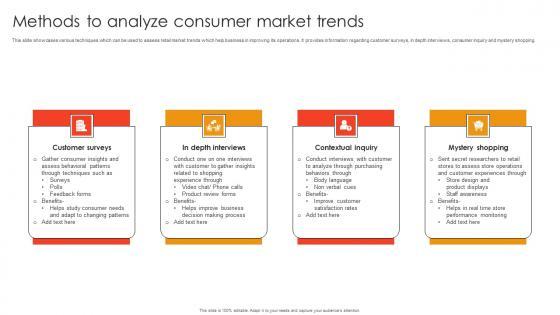 This slide showcases various techniques which can be used to assess retail market trends which help business in improving its operations. It provides information regarding customer surveys, in depth interviews, consumer inquiry and mystery shopping. Pitch your topic with ease and precision using this Methods To Analyze Consumer Market Trends Template Pdf. This layout presents information on Customer Surveys, In Depth Interviews, Contextual Inquiry. It is also available for immediate download and adjustment. So, changes can be made in the color, design, graphics or any other component to create a unique layout. This slide showcases various techniques which can be used to assess retail market trends which help business in improving its operations. It provides information regarding customer surveys, in depth interviews, consumer inquiry and mystery shopping.
