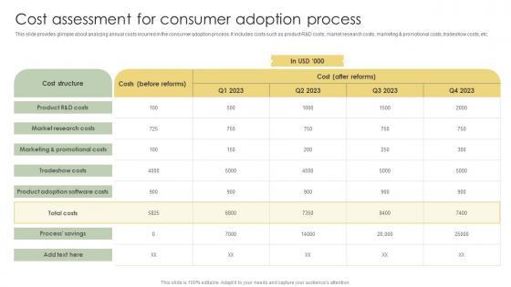 This slide provides glimpse about analyzing annual costs incurred in the consumer adoption process. It includes costs such as product RAndD costs, market research costs, marketing And promotional costs, tradeshow costs, etc.From laying roadmaps to briefing everything in detail, our templates are perfect for you. You can set the stage with your presentation slides. All you have to do is download these easy-to-edit and customizable templates. Cost Assessment For Consumer Adoption Process Analyzing Customer Adoption Journey Guidelines Pdf will help you deliver an outstanding performance that everyone would remember and praise you for. Do download this presentation today. This slide provides glimpse about analyzing annual costs incurred in the consumer adoption process. It includes costs such as product R AndD costs, market research costs, marketing And promotional costs, tradeshow costs, etc.