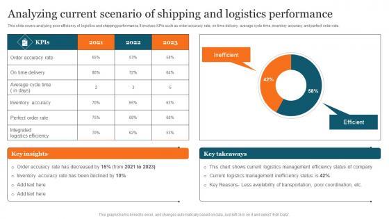 This slide covers analyzing poor efficiency of logistics and shipping performance. It involves KPIs such as order accuracy rate, on time delivery, average cycle time, inventory accuracy and perfect order rate. Create an editable Analyzing Current Scenario Of Shipping And Logistics Performance Themes PDF that communicates your idea and engages your audience. Whether youre presenting a business or an educational presentation, pre-designed presentation templates help save time. Analyzing Current Scenario Of Shipping And Logistics Performance Themes PDF is highly customizable and very easy to edit, covering many different styles from creative to business presentations. Slidegeeks has creative team members who have crafted amazing templates. So, go and get them without any delay.