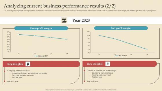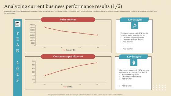 The following slide highlights existing business performance indicators to review and plan corrective actions of improvement. It includes elements such as quarterly sales revenue, customer acquisition cost along with key insights etc. This modern and well arranged Analyzing Current Describing Business Performance Administration Goals Microsoft Pdf provides lots of creative possibilities. It is very simple to customize and edit with the Powerpoint Software. Just drag and drop your pictures into the shapes. All facets of this template can be edited with Powerpoint, no extra software is necessary. Add your own material, put your images in the places assigned for them, adjust the colors, and then you can show your slides to the world, with an animated slide included. The following slide highlights existing business performance indicators to review and plan corrective actions of improvement. It includes elements such as quarterly sales revenue, customer acquisition cost along with key insights etc.