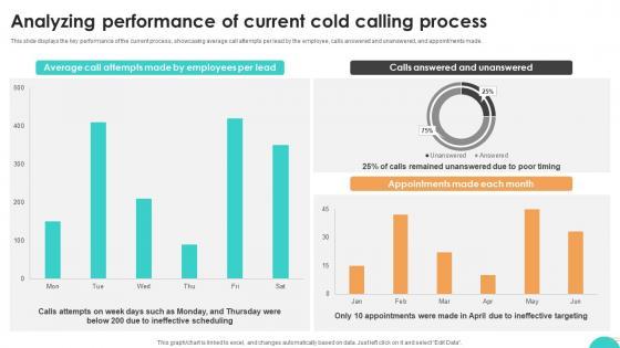 This slide displays the key performance of the current process, showcasing average call attempts per lead by the employee, calls answered and unanswered, and appointments made. Want to ace your presentation in front of a live audience Our Ultimate Guide To Cold Analyzing Performance Of Current Cold SA SS V can help you do that by engaging all the users towards you. Slidegeeks experts have put their efforts and expertise into creating these impeccable powerpoint presentations so that you can communicate your ideas clearly. Moreover, all the templates are customizable, and easy-to-edit and downloadable. Use these for both personal and commercial use. This slide displays the key performance of the current process, showcasing average call attempts per lead by the employee, calls answered and unanswered, and appointments made.