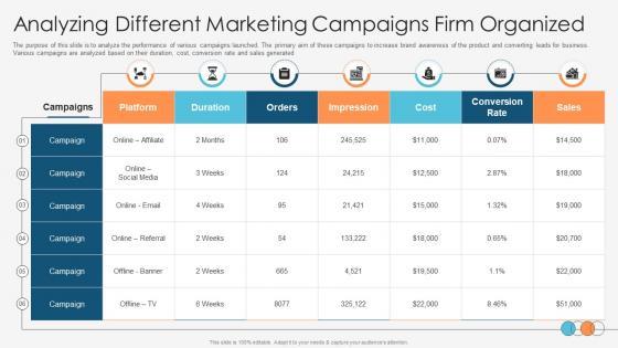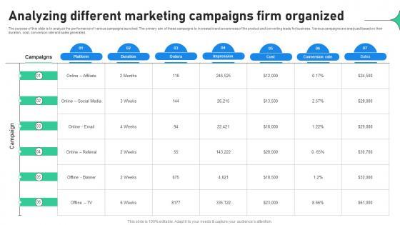 The purpose of this slide is to analyze the performance of various campaigns launched. The primary aim of these campaigns to increase brand awareness of the product and converting leads for business. Various campaigns are analyzed based on their duration, cost, conversion rate and sales generated. Deliver an awe inspiring pitch with this creative Manual To Develop Strawman Proposal Analyzing Different Marketing Campaigns Firm Organized Rules PDF bundle. Topics like Analyzing Different Marketing, Campaigns Firm Organized, Sales can be discussed with this completely editable template. It is available for immediate download depending on the needs and requirements of the user.