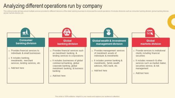 This slide provides glimpse about multiple services provided by different divisions of the retail banking business to showcase the overall operations. It includes divisions such as consumer banking division, global banking division, global markets division, etc. Explore a selection of the finest Analyzing Different Operations Marketing Plan For Boosting Client Retention In Retail Banking Sample Pdf here. With a plethora of professionally designed and pre made slide templates, you can quickly and easily find the right one for your upcoming presentation. You can use our Analyzing Different Operations Marketing Plan For Boosting Client Retention In Retail Banking Sample Pdf to effectively convey your message to a wider audience. Slidegeeks has done a lot of research before preparing these presentation templates. The content can be personalized and the slides are highly editable. Grab templates today from Slidegeeks. This slide provides glimpse about multiple services provided by different divisions of the retail banking business to showcase the overall operations. It includes divisions such as consumer banking division, global banking division, global markets division, etc.