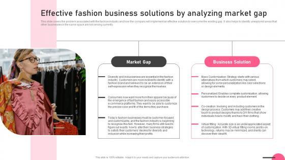 This slide covers the problem associated with the fashion industry and how the company will implement an effective solution to overcome the existing gap. It also helps to identify unexplored areas that other businesses in the same space are not serving currently. Whether you have daily or monthly meetings, a brilliant presentation is necessary. Effective Fashion Business Solutions By Analyzing Market Gap Boutique Business Slides Pdf can be your best option for delivering a presentation. Represent everything in detail using Effective Fashion Business Solutions By Analyzing Market Gap Boutique Business Slides Pdf and make yourself stand out in meetings. The template is versatile and follows a structure that will cater to your requirements. All the templates prepared by Slidegeeks are easy to download and edit. Our research experts have taken care of the corporate themes as well. So, give it a try and see the results. This slide covers the problem associated with the fashion industry and how the company will implement an effective solution to overcome the existing gap. It also helps to identify unexplored areas that other businesses in the same space are not serving currently.
