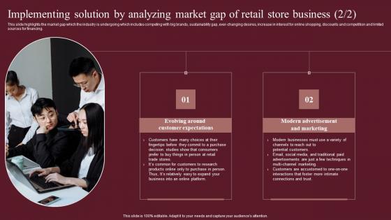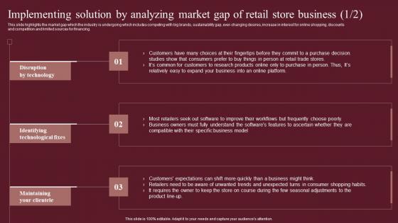 This slide highlights the market gap which the industry is undergoing which includes competing with big brands, sustainability gap, ever-changing desires, increase in interest for online shopping, discounts and competition and limited sources for financing. This modern and well-arranged Implementing Solution By Analyzing Market Gap Fashion Business Plan Microsoft Pdf provides lots of creative possibilities. It is very simple to customize and edit with the Powerpoint Software. Just drag and drop your pictures into the shapes. All facets of this template can be edited with Powerpoint, no extra software is necessary. Add your own material, put your images in the places assigned for them, adjust the colors, and then you can show your slides to the world, with an animated slide included. This slide highlights the market gap which the industry is undergoing which includes competing with big brands, sustainability gap, ever-changing desires, increase in interest for online shopping, discounts and competition and limited sources for financing.
