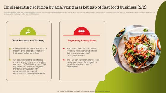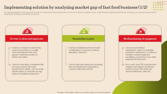 This slide highlights the market gap which the industry is undergoing which includes service is slow and imprecise, sensitivity to price, malfunctioning of equipment, staff turnover and training, and regulatory perquisites for analyzing the challenges in the fast food business.This modern and well-arranged Implementing Solution By Analyzing Market Gap Small Fast Food Business Plan Portrait Pdf provides lots of creative possibilities. It is very simple to customize and edit with the Powerpoint Software. Just drag and drop your pictures into the shapes. All facets of this template can be edited with Powerpoint no extra software is necessary. Add your own material, put your images in the places assigned for them, adjust the colors, and then you can show your slides to the world, with an animated slide included. This slide highlights the market gap which the industry is undergoing which includes service is slow and imprecise, sensitivity to price, malfunctioning of equipment, staff turnover and training, and regulatory perquisites for analyzing the challenges in the fast food business.