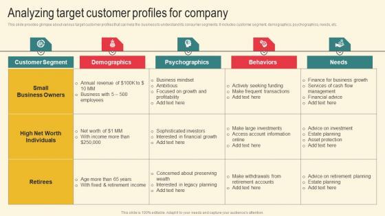 This slide provides glimpse about various target customer profiles that can help the business to understand its consumer segments. It includes customer segment, demographics, psychographics, needs, etc. The best PPT templates are a great way to save time, energy, and resources. Slidegeeks have 100 percent editable powerpoint slides making them incredibly versatile. With these quality presentation templates, you can create a captivating and memorable presentation by combining visually appealing slides and effectively communicating your message. Download Analyzing Target Customer Marketing Plan For Boosting Client Retention In Retail Banking Topics Pdf from Slidegeeks and deliver a wonderful presentation. This slide provides glimpse about various target customer profiles that can help the business to understand its consumer segments. It includes customer segment, demographics, psychographics, needs, etc.