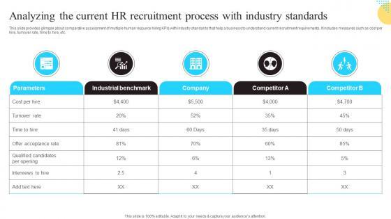 This slide provides glimpse about comparative assessment of multiple human resource hiring KPIs with industry standards that help a business to understand current recruitment requirements. It includes measures such as cost per hire, turnover rate, time to hire, etc.Slidegeeks is one of the best resources for PowerPoint templates. You can download easily and regulate Analyzing The Current HR Recruitment Process With Complete Guidelines For Streamlined Designs Pdf for your personal presentations from our wonderful collection. A few clicks is all it takes to discover and get the most relevant and appropriate templates. Use our Templates to add a unique zing and appeal to your presentation and meetings. All the slides are easy to edit and you can use them even for advertisement purposes. This slide provides glimpse about comparative assessment of multiple human resource hiring KPIs with industry standards that help a business to understand current recruitment requirements. It includes measures such as cost per hire, turnover rate, time to hire, etc.