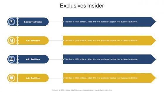 Introducing our well-designed Exclusives Insider In Powerpoint And Google Slides Cpb. This PowerPoint design presents information on topics like Exclusives Insider. As it is predesigned it helps boost your confidence level. It also makes you a better presenter because of its high-quality content and graphics. This PPT layout can be downloaded and used in different formats like PDF, PNG, and JPG. Not only this, it is available in both Standard Screen and Widescreen aspect ratios for your convenience. Therefore, click on the download button now to persuade and impress your audience. Our Exclusives Insider In Powerpoint And Google Slides Cpb are topically designed to provide an attractive backdrop to any subject. Use them to look like a presentation pro.