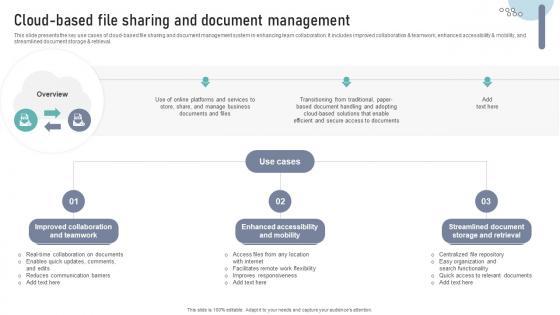 This slide presents the key use cases of cloud-based file sharing and document management system in enhancing team collaboration. It includes improved collaboration and teamwork, enhanced accessibility and mobility, and streamlined document storage and retrieval.Do you have an important presentation coming up Are you looking for something that will make your presentation stand out from the rest Look no further than Cloud Based File Sharing And Document Management DT SS V. With our professional designs, you can trust that your presentation will pop and make delivering it a smooth process. And with Slidegeeks, you can trust that your presentation will be unique and memorable. So why wait Grab Cloud Based File Sharing And Document Management DT SS V today and make your presentation stand out from the rest This slide presents the key use cases of cloud-based file sharing and document management system in enhancing team collaboration. It includes improved collaboration and teamwork, enhanced accessibility and mobility, and streamlined document storage and retrieval.