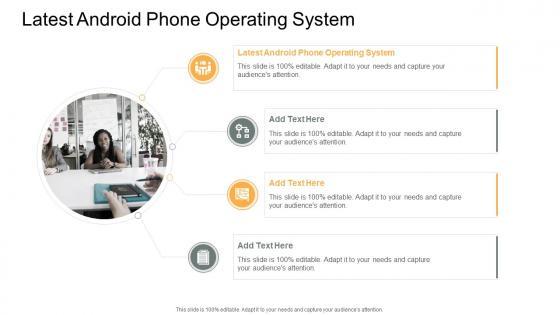 Introducing our well-designed Latest Android Phone Operating System In Powerpoint And Google Slides Cpb. This PowerPoint design presents information on topics like Latest Android Phone Operating System. As it is predesigned it helps boost your confidence level. It also makes you a better presenter because of its high-quality content and graphics. This PPT layout can be downloaded and used in different formats like PDF, PNG, and JPG. Not only this, it is available in both Standard Screen and Widescreen aspect ratios for your convenience. Therefore, click on the download button now to persuade and impress your audience. Our Latest Android Phone Operating System In Powerpoint And Google Slides Cpb are topically designed to provide an attractive backdrop to any subject. Use them to look like a presentation pro.