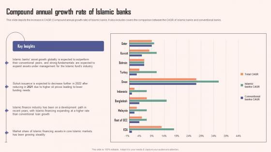 This slide depicts the increase in CAGR Compound annual growth rate of Islamic banks. It also includes covers the comparison between the CAGR of Islamic banks and conventional banks. Slidegeeks is here to make your presentations a breeze with Compound Annual Growth Rate Of Islamic Banks Comprehensive Guide Islamic Themes PDF With our easy-to-use and customizable templates, you can focus on delivering your ideas rather than worrying about formatting. With a variety of designs to choose from, you are sure to find one that suits your needs. And with animations and unique photos, illustrations, and fonts, you can make your presentation pop. So whether you are giving a sales pitch or presenting to the board, make sure to check out Slidegeeks first This slide depicts the increase in CAGR Compound annual growth rate of Islamic banks. It also includes covers the comparison between the CAGR of Islamic banks and conventional banks.