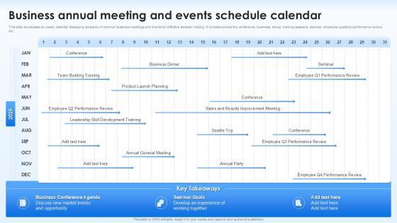 Do you have to make sure that everyone on your team knows about any specific topic I yes, then you should give Business Annual Meeting And Events Schedule Calendar a try. Our experts have put a lot of knowledge and effort into creating this impeccable Business Annual Meeting And Events Schedule Calendar. You can use this template for your upcoming presentations, as the slides are perfect to represent even the tiniest detail. You can download these templates from the Slidegeeks website and these are easy to edit. So grab these today This slide presents an annual calendar outlining key business meetings and events for better decision-making. It features events such as conferences, business dinners, training sessions, seminars, and quarterly employee performance reviews.