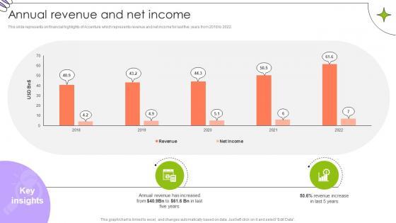 This slide represents on financial highlights of Accenture which represents revenue and net income for last five years from 2018 to 2022.Boost your pitch with our creative Annual Revenue And Net Income Global Consulting And Technology Services Company Profile CP SS V. Deliver an awe-inspiring pitch that will mesmerize everyone. Using these presentation templates you will surely catch everyones attention. You can browse the ppts collection on our website. We have researchers who are experts at creating the right content for the templates. So you do not have to invest time in any additional work. Just grab the template now and use them. This slide represents on financial highlights of Accenture which represents revenue and net income for last five years from 2018 to 2022.
