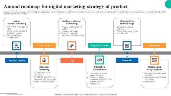 Mentioned slide showcases product marketing strategy to analyze various activities over year to set the schedule. It comprises of strategies such as setting timeline and budget, leveraging automation, ensuring high quality content, collaborating with influencers etc. Showcasing this set of slides titled Annual Roadmap For Digital Marketing Strategy Of Product Inspiration Pdf. The topics addressed in these templates are January, April, July, August. All the content presented in this PPT design is completely editable. Download it and make adjustments in color, background, font etc. as per your unique business setting. Mentioned slide showcases product marketing strategy to analyze various activities over year to set the schedule. It comprises of strategies such as setting timeline and budget, leveraging automation, ensuring high quality content, collaborating with influencers etc.