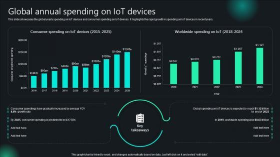 This slide showcases the global yearly spending on IoT devices and consumer spending on IoT devices. It highlights the rapid growth in spending on IoT devices in recent years. Welcome to our selection of the Unlocking Potential IoTs Application Global Annual Spending On IoT Devices IoT SS V. These are designed to help you showcase your creativity and bring your sphere to life. Planning and Innovation are essential for any business that is just starting out. This collection contains the designs that you need for your everyday presentations. All of our PowerPoints are 100Percent editable, so you can customize them to suit your needs. This multi-purpose template can be used in various situations. Grab these presentation templates today. This slide showcases the global yearly spending on IoT devices and consumer spending on IoT devices. It highlights the rapid growth in spending on IoT devices in recent years.