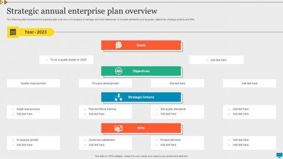 The following slide represents the business plan overview of a company to manage and track milestones. It includes elements such as goals, objectives, strategic actions and KPIs. Showcasing this set of slides titled Strategic Annual Enterprise Plan Overview Summary PDF. The topics addressed in these templates are Goals, Objectives, Strategic Actions. All the content presented in this PPT design is completely editable. Download it and make adjustments in color, background, font etc. as per your unique business setting.