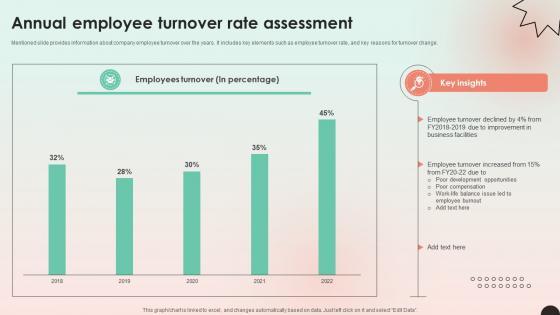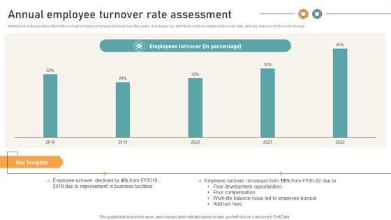 Mentioned slide provides information about company employee turnover over the years. It includes key elements such as employee turnover rate, and key reasons for turnover change. From laying roadmaps to briefing everything in detail, our templates are perfect for you. You can set the stage with your presentation slides. All you have to do is download these easy-to-edit and customizable templates. Web Consulting Business Annual Employee Turnover Rate Assessment will help you deliver an outstanding performance that everyone would remember and praise you for. Do download this presentation today. Mentioned slide provides information about company employee turnover over the years. It includes key elements such as employee turnover rate, and key reasons for turnover change.