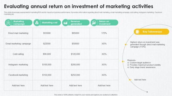 This slide showcases assessment of marketing ROI and its impact on business performance. It provides information regarding direct mail marketing, email marketing campaign, cold calling, Instagram marketing, Facebook marketing etc. The best PPT templates are a great way to save time, energy, and resources. Slidegeeks have 100 percent editable powerpoint slides making them incredibly versatile. With these quality presentation templates, you can create a captivating and memorable presentation by combining visually appealing slides and effectively communicating your message. Download Evaluating Annual Return On Investment Comprehensive Guide To Wholesale Ppt Sample from Slidegeeks and deliver a wonderful presentation. This slide showcases assessment of marketing ROI and its impact on business performance. It provides information regarding direct mail marketing, email marketing campaign, cold calling, Instagram marketing, Facebook marketing etc.