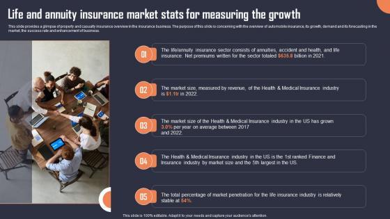 This slide provides a glimpse of property and casualty insurance overview in the insurance business. The purpose of this slide is concerning with the overview of automobile insurance, its growth, demand and its forecasting in the market, the success rate and enhancement of business. This modern and well-arranged Life And Annuity Insurance Market Stats For Measuring The Growth Assurant Insurance Agency Template Pdf provides lots of creative possibilities. It is very simple to customize and edit with the Powerpoint Software. Just drag and drop your pictures into the shapes. All facets of this template can be edited with Powerpoint no extra software is necessary. Add your own material, put your images in the places assigned for them, adjust the colors, and then you can show your slides to the world, with an animated slide included. This slide provides a glimpse of property and casualty insurance overview in the insurance business. The purpose of this slide is concerning with the overview of automobile insurance, its growth, demand and its forecasting in the market, the success rate and enhancement of business.