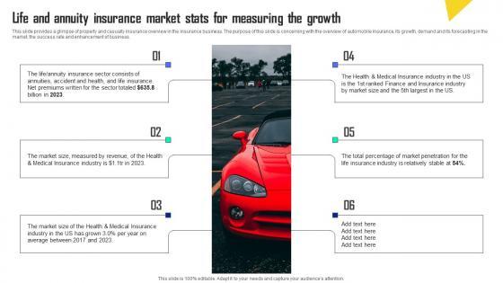 This slide provides a glimpse of property and casualty insurance overview in the insurance business. The purpose of this slide is concerning with the overview of automobile insurance, its growth, demand and its forecasting in the market, the success rate and enhancement of business. This modern and well-arranged Life And Annuity Insurance Market Stats For Measuring The Automobile Insurance Agency Template Pdf provides lots of creative possibilities. It is very simple to customize and edit with the Powerpoint Software. Just drag and drop your pictures into the shapes. All facets of this template can be edited with Powerpoint no extra software is necessary. Add your own material, put your images in the places assigned for them, adjust the colors, and then you can show your slides to the world, with an animated slide included. This slide provides a glimpse of property and casualty insurance overview in the insurance business. The purpose of this slide is concerning with the overview of automobile insurance, its growth, demand and its forecasting in the market, the success rate and enhancement of business.