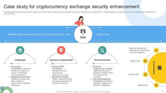 The following slide provides the financial institution compliance case study that helps to understand the various challenges and solutions of AML implementation. Key components are aim, challenges, the result achieved, and conclusion. Find highly impressive Case Study For Cryptocurrency Exchange Security Mapping Out The Anti Money Fin SS V on Slidegeeks to deliver a meaningful presentation. You can save an ample amount of time using these presentation templates. No need to worry to prepare everything from scratch because Slidegeeks experts have already done a huge research and work for you. You need to download Case Study For Cryptocurrency Exchange Security Mapping Out The Anti Money Fin SS V for your upcoming presentation. All the presentation templates are 100 percent editable and you can change the color and personalize the content accordingly. Download now The following slide provides the financial institution compliance case study that helps to understand the various challenges and solutions of AML implementation. Key components are aim, challenges, the result achieved, and conclusion.