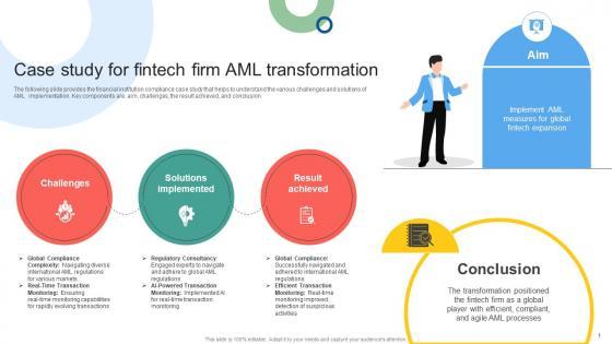 The following slide provides the financial institution compliance case study that helps to understand the various challenges and solutions of AML implementation. Key components are aim, challenges, the result achieved, and conclusion. If your project calls for a presentation, then Slidegeeks is your go-to partner because we have professionally designed, easy-to-edit templates that are perfect for any presentation. After downloading, you can easily edit Case Study For Fintech Firm AML Transformation Mapping Out The Anti Money Fin SS V and make the changes accordingly. You can rearrange slides or fill them with different images. Check out all the handy templates The following slide provides the financial institution compliance case study that helps to understand the various challenges and solutions of AML implementation. Key components are aim, challenges, the result achieved, and conclusion