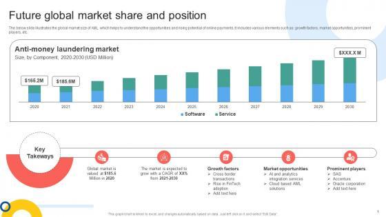 The below slide illustrates the global market size of AML which helps to understand the opportunities and rising potential of online payments. It includes various elements such as growth factors, market opportunities, prominent players, etc. This Future Global Market Share And Position Mapping Out The Anti Money Fin SS V is perfect for any presentation, be it in front of clients or colleagues. It is a versatile and stylish solution for organizing your meetings. The Future Global Market Share And Position Mapping Out The Anti Money Fin SS V features a modern design for your presentation meetings. The adjustable and customizable slides provide unlimited possibilities for acing up your presentation. Slidegeeks has done all the homework before launching the product for you. So, do not wait, grab the presentation templates today The below slide illustrates the global market size of AML which helps to understand the opportunities and rising potential of online payments. It includes various elements such as growth factors, market opportunities, prominent players, etc.