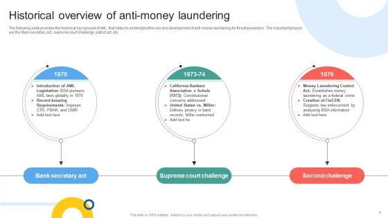 The following slide provides the historical background of AML that helps to understand the rise and development of anti-money laundering for threat prevention. The important phases are the Bank secretary act, supreme court challenge, patriot act, etc. The Historical Overview Of Anti Money Laundering Mapping Out The Anti Money Fin SS V is a compilation of the most recent design trends as a series of slides. It is suitable for any subject or industry presentation, containing attractive visuals and photo spots for businesses to clearly express their messages. This template contains a variety of slides for the user to input data, such as structures to contrast two elements, bullet points, and slides for written information. Slidegeeks is prepared to create an impression. The following slide provides the historical background of AML that helps to understand the rise and development of anti-money laundering for threat prevention. The important phases are the Bank secretary act, supreme court challenge, patriot act, etc.