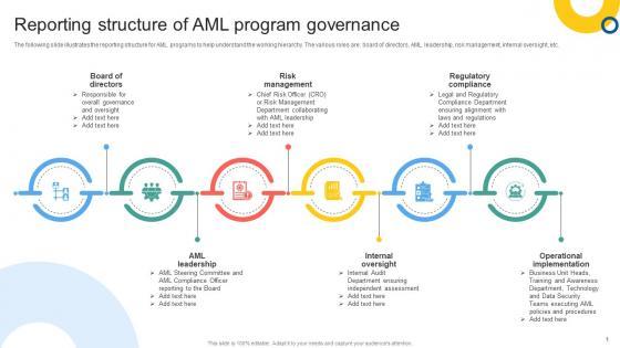 The following slide illustrates the reporting structure for AML programs to help understand the working hierarchy. The various roles are board of directors, AML leadership, risk management, internal oversight, etc. There are so many reasons you need a Reporting Structure Of AML Program Mapping Out The Anti Money Fin SS V. The first reason is you can not spend time making everything from scratch, Thus, Slidegeeks has made presentation templates for you too. You can easily download these templates from our website easily. The following slide illustrates the reporting structure for AML programs to help understand the working hierarchy. The various roles are board of directors, AML leadership, risk management, internal oversight, etc.
