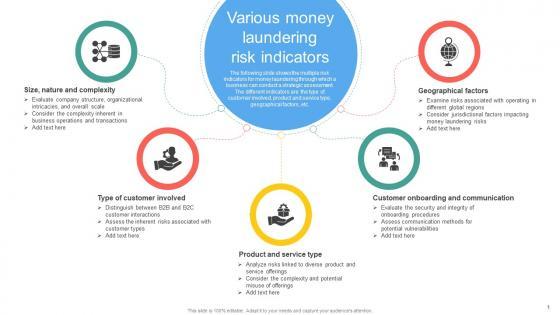 The following slide shows the multiple risk indicators for money laundering through which a business can conduct a strategic assessment. The different indicators are the type of customer involved, product and service type, geographical factors, etc. Find highly impressive Various Money Laundering Risk Indicators Mapping Out The Anti Money Fin SS V on Slidegeeks to deliver a meaningful presentation. You can save an ample amount of time using these presentation templates. No need to worry to prepare everything from scratch because Slidegeeks experts have already done a huge research and work for you. You need to download Various Money Laundering Risk Indicators Mapping Out The Anti Money Fin SS V for your upcoming presentation. All the presentation templates are 100 percent editable and you can change the color and personalize the content accordingly. Download now The following slide shows the multiple risk indicators for money laundering through which a business can conduct a strategic assessment. The different indicators are the type of customer involved, product and service type, geographical factors, etc.