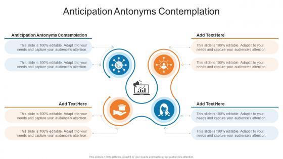 Introducing our well-designed Anticipation Antonyms Contemplation In Powerpoint And Google Slides Cpb. This PowerPoint design presents information on topics like Anticipation Antonyms Contemplation. As it is predesigned it helps boost your confidence level. It also makes you a better presenter because of its high-quality content and graphics. This PPT layout can be downloaded and used in different formats like PDF, PNG, and JPG. Not only this, it is available in both Standard Screen and Widescreen aspect ratios for your convenience. Therefore, click on the download button now to persuade and impress your audience. Our Anticipation Antonyms Contemplation In Powerpoint And Google Slides Cpb are topically designed to provide an attractive backdrop to any subject. Use them to look like a presentation pro.