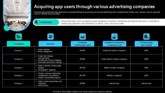 Following slide provide information about various companies that helps to acquire app users through advertising and other marketing tactics. It further cover overview, services, estimated revenue, suitability and pricing details. If you are looking for a format to display your unique thoughts, then the professionally designed Acquiring App Users Through Various Advertising Companies Formats PDF is the one for you. You can use it as a Google Slides template or a PowerPoint template. Incorporate impressive visuals, symbols, images, and other charts. Modify or reorganize the text boxes as you desire. Experiment with shade schemes and font pairings. Alter, share or cooperate with other people on your work. Download Acquiring App Users Through Various Advertising Companies Formats PDF and find out how to give a successful presentation. Present a perfect display to your team and make your presentation unforgettable.