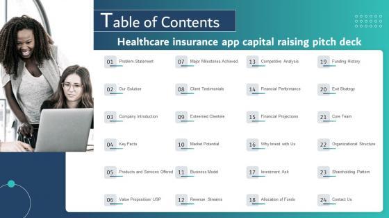 Find highly impressive Table Of Contents Healthcare Insurance App Capital Raising Pitch Deck Download Pdf on Slidegeeks to deliver a meaningful presentation. You can save an ample amount of time using these presentation templates. No need to worry to prepare everything from scratch because Slidegeeks experts have already done a huge research and work for you. You need to download Table Of Contents Healthcare Insurance App Capital Raising Pitch Deck Download Pdf for your upcoming presentation. All the presentation templates are 100 percent editable and you can change the color and personalize the content accordingly. Download now Our Table Of Contents Healthcare Insurance App Capital Raising Pitch Deck Download Pdf are topically designed to provide an attractive backdrop to any subject. Use them to look like a presentation pro.