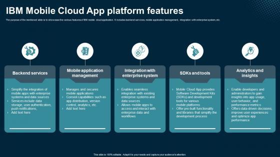 The purpose of the mentioned slide is to showcase the various features of IBM mobile cloud application. It includes bankend services, mobile application management, integration with enterprise system, etc. Crafting an eye-catching presentation has never been more straightforward. Let your presentation shine with this tasteful yet straightforward IBM Mobile Cloud App Platform Features Application Areas Of Mobile Cloud Computing template. It offers a minimalistic and classy look that is great for making a statement. The colors have been employed intelligently to add a bit of playfulness while still remaining professional. Construct the ideal IBM Mobile Cloud App Platform Features Application Areas Of Mobile Cloud Computing that effortlessly grabs the attention of your audience Begin now and be certain to wow your customers The purpose of the mentioned slide is to showcase the various features of IBM mobile cloud application. It includes bankend services, mobile application management, integration with enterprise system, etc.