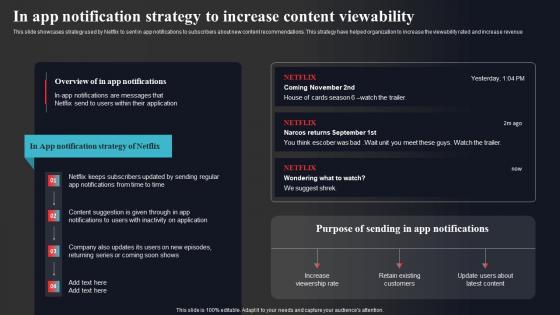 This slide showcases strategy used by Netflix to sent in app notifications to subscribers about new content recommendations. This strategy have helped organization to increase the viewability rated and increase revenue Here you can discover an assortment of the finest PowerPoint and Google Slides templates. With these templates, you can create presentations for a variety of purposes while simultaneously providing your audience with an eye-catching visual experience. Download In App Notification Strategy To Increase Content Viewability Enhancing Online Visibility Professional Pdf to deliver an impeccable presentation. These templates will make your job of preparing presentations much quicker, yet still, maintain a high level of quality. Slidegeeks has experienced researchers who prepare these templates and write high-quality content for you. Later on, you can personalize the content by editing the In App Notification Strategy To Increase Content Viewability Enhancing Online Visibility Professional Pdf This slide showcases strategy used by Netflix to sent in app notifications to subscribers about new content recommendations. This strategy have helped organization to increase the viewability rated and increase revenue