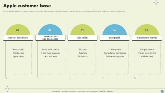 Mentioned slide displays company primary customer base. It comprises of general consumers, small and mid-size businesses, education, enterprises, and government agencies.Create an editable Apple Customer Base Consumer Electronics Company Profile CP SS V that communicates your idea and engages your audience. Whether you are presenting a business or an educational presentation, pre-designed presentation templates help save time. Apple Customer Base Consumer Electronics Company Profile CP SS V is highly customizable and very easy to edit, covering many different styles from creative to business presentations. Slidegeeks has creative team members who have crafted amazing templates. So, go and get them without any delay. Mentioned slide displays company primary customer base. It comprises of general consumers, small and mid-size businesses, education, enterprises, and government agencies.
