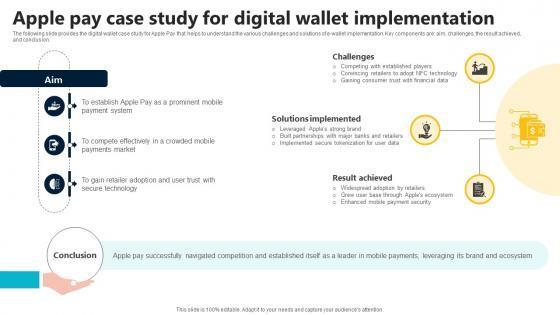 The following slide provides the digital wallet case study for Apple Pay that helps to understand the various challenges and solutions of e-wallet implementation. Key components are aim, challenges, the result achieved, and conclusion. Create an editable Apple Pay Case Study For Digital Wallet Implementation In Depth Guide To Digital Wallets Fin SS V that communicates your idea and engages your audience. Whether you are presenting a business or an educational presentation, pre-designed presentation templates help save time. Apple Pay Case Study For Digital Wallet Implementation In Depth Guide To Digital Wallets Fin SS V is highly customizable and very easy to edit, covering many different styles from creative to business presentations. Slidegeeks has creative team members who have crafted amazing templates. So, go and get them without any delay. The following slide provides the digital wallet case study for Apple Pay that helps to understand the various challenges and solutions of e-wallet implementation. Key components are aim, challenges, the result achieved, and conclusion.