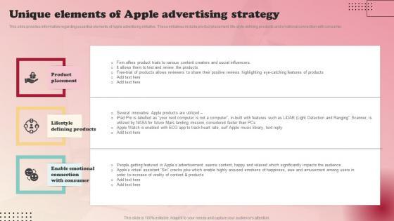 This slide provides information regarding essential elements of Apple advertising initiative. These initiatives include product placement, life-style defining products and emotional connection with consumer. Create an editable Product Branding Strategy Of Apple Unique Elements Of Apple Advertising Demonstration Pdf that communicates your idea and engages your audience. Whether you are presenting a business or an educational presentation, pre-designed presentation templates help save time. Product Branding Strategy Of Apple Unique Elements Of Apple Advertising Demonstration Pdf is highly customizable and very easy to edit, covering many different styles from creative to business presentations. Slidegeeks has creative team members who have crafted amazing templates. So, go and get them without any delay. This slide provides information regarding essential elements of Apple advertising initiative. These initiatives include product placement, life-style defining products and emotional connection with consumer.