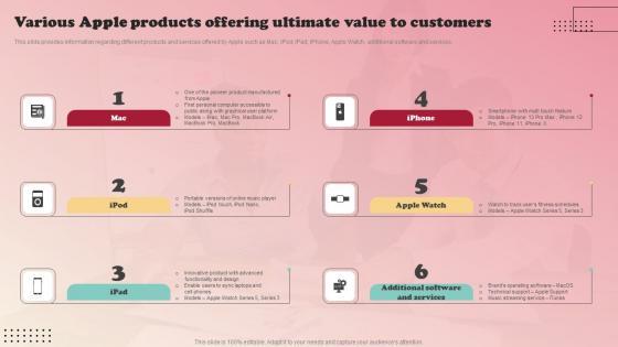 This slide provides information regarding different products and services offered by Apple such as Mac, iPod, iPad, iPhone, Apple Watch, additional software and services. Explore a selection of the finest Various Apple Products Offering Ultimate Value To Customers Apples Proficiency In Optimizing Formats Pdf here. With a plethora of professionally designed and pre-made slide templates, you can quickly and easily find the right one for your upcoming presentation. You can use our Various Apple Products Offering Ultimate Value To Customers Apples Proficiency In Optimizing Formats Pdf to effectively convey your message to a wider audience. Slidegeeks has done a lot of research before preparing these presentation templates. The content can be personalized and the slides are highly editable. Grab templates today from Slidegeeks. This slide provides information regarding different products and services offered by Apple such as Mac, iPod, iPad, iPhone, Apple Watch, additional software and services.
