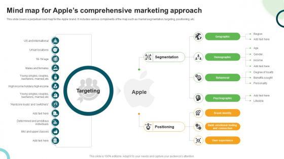 This slide covers a perpetual road map for the Apple brand. It includes various components of the map such as market segmentation, targeting, positioning, etc. Welcome to our selection of the Types And Examples Of Product Mind Map For Apples Comprehensive Marketing Approach. These are designed to help you showcase your creativity and bring your sphere to life. Planning and Innovation are essential for any business that is just starting out. This collection contains the designs that you need for your everyday presentations. All of our PowerPoints are 100Percent editable, so you can customize them to suit your needs. This multi-purpose template can be used in various situations. Grab these presentation templates today. This slide covers a perpetual road map for the Apple brand. It includes various components of the map such as market segmentation, targeting, positioning, etc.