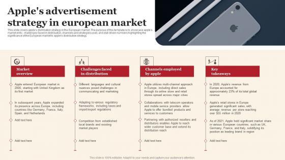 This slide covers apples distribution strategy in the European market. The purpose of this template is to showcase apples market entry, challenges faced in distribution, channels and strategies used, and stat-driven numbers highlighting the significance of the European market to apples distribution strategy. Pitch your topic with ease and precision using this Apples Advertisement Strategy In European Market Elements Pdf This layout presents information on Market Overview, Channels Employed By Apple, Key Takeaways It is also available for immediate download and adjustment. So, changes can be made in the color, design, graphics or any other component to create a unique layout. This slide covers apples distribution strategy in the European market. The purpose of this template is to showcase apples market entry, challenges faced in distribution, channels and strategies used, and stat-driven numbers highlighting the significance of the European market to apples distribution strategy.
