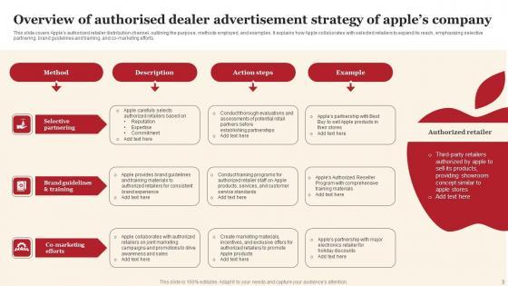 This slide covers Apples authorized retailer distribution channel, outlining the purpose, methods employed, and examples. It explains how Apple collaborates with selected retailers to expand its reach, emphasizing selective partnering, brand guidelines and training, and co-marketing efforts. Showcasing this set of slides titled Overview Of Authorised Dealer Advertisement Strategy Of Apples Company Mockup Pdf The topics addressed in these templates are Selective Partnering, Brand Guidelines And Training, Co Marketing Efforts All the content presented in this PPT design is completely editable. Download it and make adjustments in color, background, font etc. as per your unique business setting. This slide covers Apples authorized retailer distribution channel, outlining the purpose, methods employed, and examples. It explains how Apple collaborates with selected retailers to expand its reach, emphasizing selective partnering, brand guidelines and training, and co-marketing efforts.
