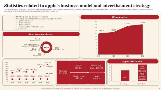 This template shows key statistics related to apples distribution strategy. The purpose of this slide is to highlight the business model used by apple to create a robust distribution strategy and continuously work on increasing revenues of all its products. It includes revenue streams, distribution graphs, etc. Pitch your topic with ease and precision using this Statistics Related To Apples Business Model And Advertisement Strategy Introduction Pdf This layout presents information on Apples Revenue Streams, Iphone Sales, Apples Distribution It is also available for immediate download and adjustment. So, changes can be made in the color, design, graphics or any other component to create a unique layout. This template shows key statistics related to apples distribution strategy. The purpose of this slide is to highlight the business model used by apple to create a robust distribution strategy and continuously work on increasing revenues of all its products. It includes revenue streams, distribution graphs, etc.