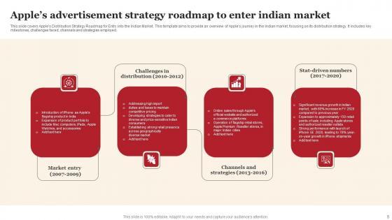 This slide covers Apples Distribution Strategy Roadmap for Entry into the Indian Market. This template aims to provide an overview of Apples journey in the Indian market, focusing on its distribution strategy. It includes key milestones, challenges faced, channels and strategies employed. Showcasing this set of slides titled Apples Advertisement Strategy Roadmap To Enter Indian Market Inspiration Pdf The topics addressed in these templates are Market Entry, Challenges In Distribution, Channels And Strategies All the content presented in this PPT design is completely editable. Download it and make adjustments in color, background, font etc. as per your unique business setting. This slide covers Apples Distribution Strategy Roadmap for Entry into the Indian Market. This template aims to provide an overview of Apples journey in the Indian market, focusing on its distribution strategy. It includes key milestones, challenges faced, channels and strategies employed.