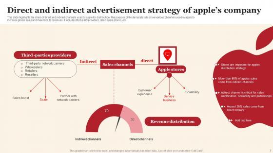 This slide highlights the share of direct and indirect channels used by apple for distribution. The purpose of this template is to show various channels used by apple to increase global sales and maximize its revenues. It includes third-party providers, direct apple stores, etc. Showcasing this set of slides titled Direct And Indirect Advertisement Strategy Of Apples Company Sample Pdf The topics addressed in these templates are Third Parties Providers, Sales Channels, Revenue Distribution All the content presented in this PPT design is completely editable. Download it and make adjustments in color, background, font etc. as per your unique business setting. This slide highlights the share of direct and indirect channels used by apple for distribution. The purpose of this template is to show various channels used by apple to increase global sales and maximize its revenues. It includes third-party providers, direct apple stores, etc.