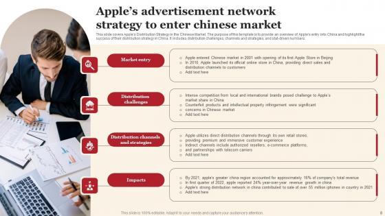 This slide covers Apples Distribution Strategy in the Chinese Market. The purpose of this template is to provide an overview of Apples entry into China and highlight the success of their distribution strategy in China. It includes distribution challenges, channels and strategies, and stat-driven numbers. Showcasing this set of slides titled Apples Advertisement Network Strategy To Enter Chinese Market Slides Pdf The topics addressed in these templates are Market Entry, Distribution Challenges, Channels And Strategies All the content presented in this PPT design is completely editable. Download it and make adjustments in color, background, font etc. as per your unique business setting. This slide covers Apples Distribution Strategy in the Chinese Market. The purpose of this template is to provide an overview of Apples entry into China and highlight the success of their distribution strategy in China. It includes distribution challenges, channels and strategies, and stat-driven numbers.