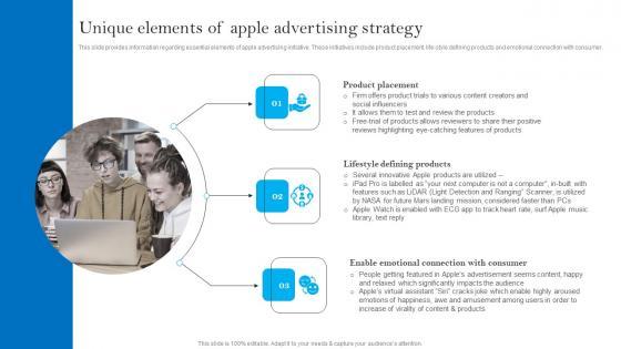 This slide provides information regarding essential elements of Apple advertising initiative. These initiatives include product placement, life style defining products and emotional connection with consumer. The best PPT templates are a great way to save time, energy, and resources. Slidegeeks have 100 percent editable powerpoint slides making them incredibly versatile. With these quality presentation templates, you can create a captivating and memorable presentation by combining visually appealing slides and effectively communicating your message. Download Unique Elements Of Apple Advertising Strategy Portrait PDF from Slidegeeks and deliver a wonderful presentation.